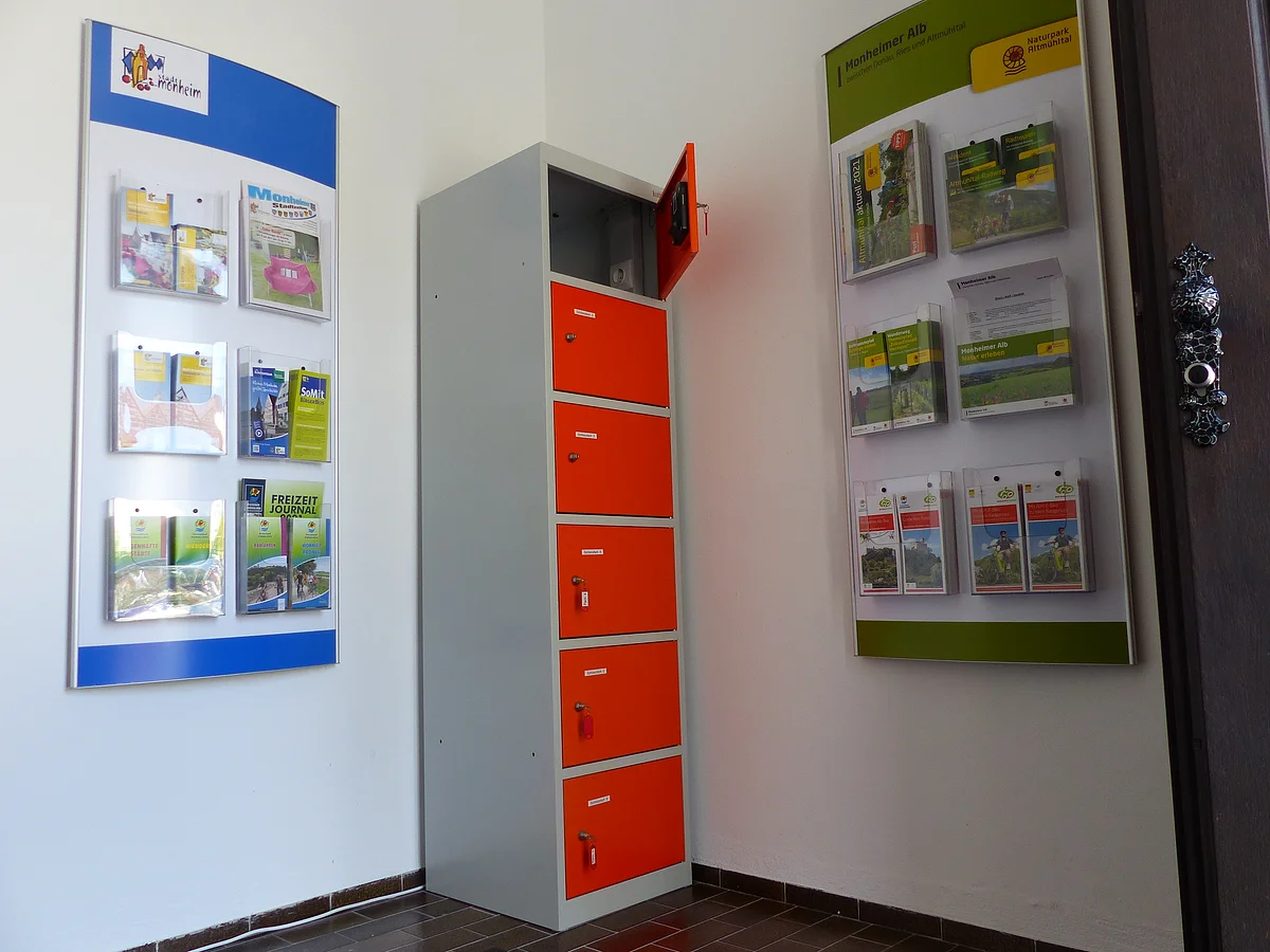 Im Vorraum der Tourist-Information befindet sich der Indoor-Ladeschrank mit sechs Steckdosen für das kostenlose Aufladen von E-Bike-Akkus. Die Fächer sind gegen ein Pfand von 1,- € während der Ladezeit abschließbar.